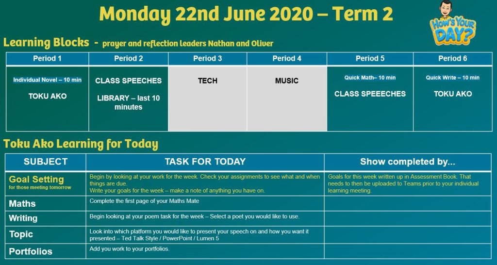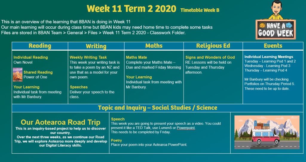 Each week I provide an overarching plan for students around our learning for the week. I have found that students need a couple of generic tasks for the students across the week. Often these are collaborative tasks. This week it is a piece of poetry (based on the writings of a NZ poet) and taking their speech and making it into a video using Lumen5. This plan is given to students via Microsoft Teams on Monday.