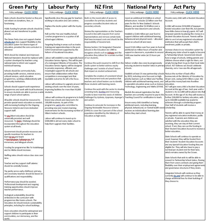 This week I have spent time collating all the education policies from the 5 main political parties. See this image below or if this is a little hard to read CLICK HERE. It certainly makes for some interesting reading.