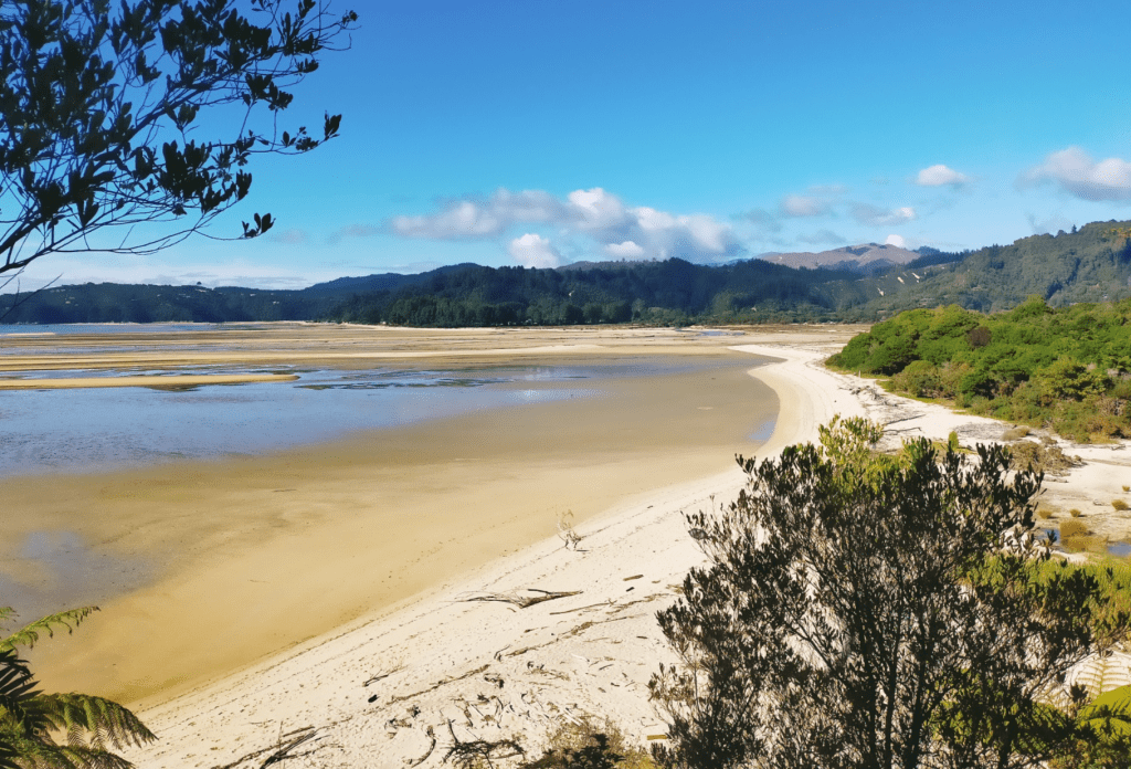 The track kicks off by crossing the Mārahau estuary on the causeway. From there you wander through open country and then into beech forest and kānuka trees. It twists in and out of small gullies before the big reveal — a view out over Anchorage Bay. The descent brings you to a big campsite and hut right on the beach. A great first stop.