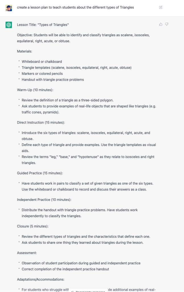 So let see how this type of technology could be used in Education. Lets say you are a beginning teacher and you need to do a lesson on Triangles….just ask ChatGPT.