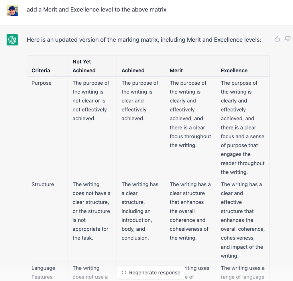 Much better. Now lets see how it will mark of piece of writing using this matrix. So I found a short Level 4 example from the TKI website and put that into the system.