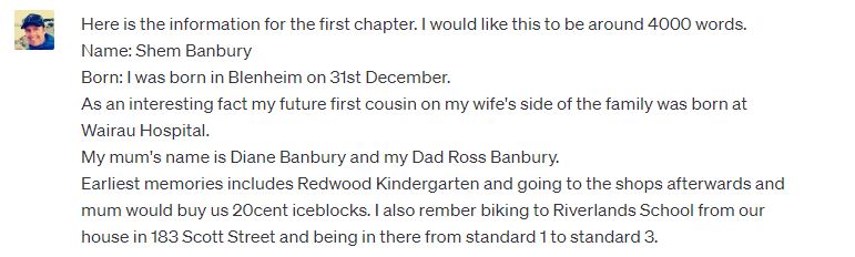 The idea to write my biography had been floating around in my mind for years, but I was daunted by the sheer magnitude of the task. Then along came ChatGPT which I had dabbled with in my job as a way of writing mundane emails and that perfect comment in a Thank You card. I felt it was time to see what this tool could do!