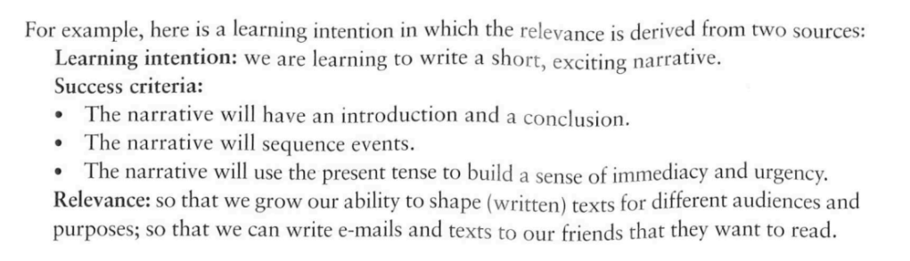 In Michael Absolum’s Book – Clarity in the Classroom he advocates for a final focus on relevance. “When teachers consider the relevance of the learning intention it will often challenge its quality”.