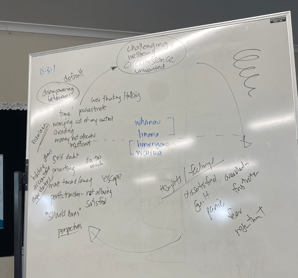 What challenged me most about Wiremu’s session was the realisation that we often prioritise the top two dimensions – family and physical health – when thinking about well-being. We naturally spend time with loved ones and engage in outdoor activities.