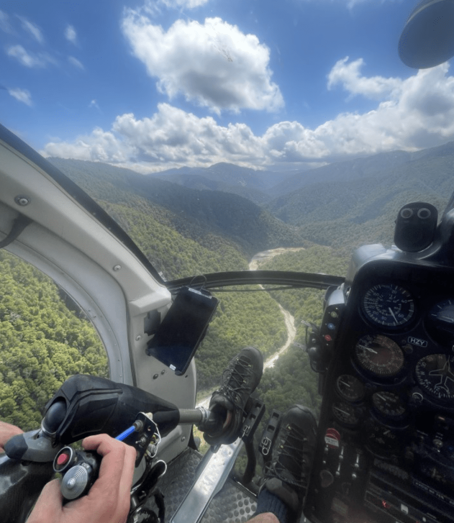 Our journey began early on January 16th, with a scenic drive from Tauranga to the Kaimanawa Forest. After a short safety briefing, we were soaring through the valley in an AS350 helicopter, bikes securely loaded, and spirits sky-high. Our pilot was Thomas Orr – more about him a little later. The ascent revealed the full grandeur of the landscape, and within moments, we were on the Patutu Tops, ready to ride