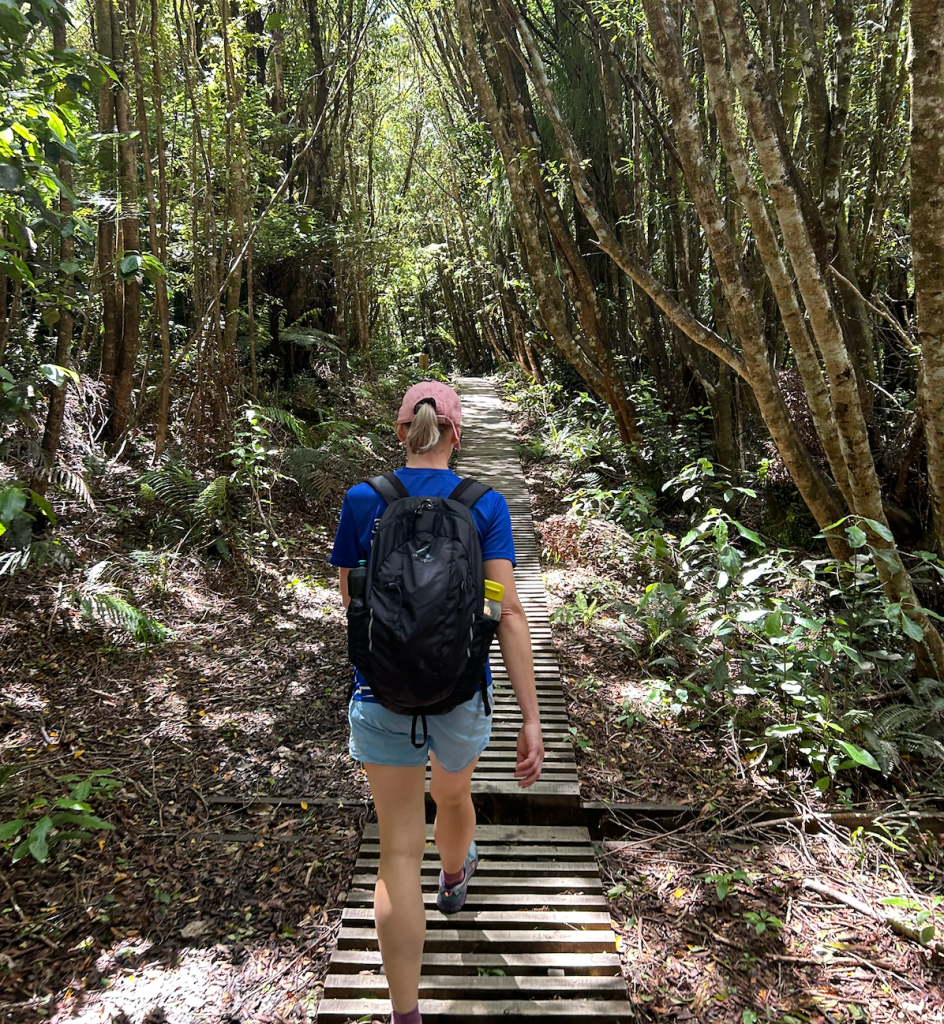 The boardwalk sections are brilliant and slightly treacherous — DOC even warns they can be a tripping hazard. At some point I noticed Rachel had entered a new pace category. Not running. Not walking. A Lioness power-walk: purposeful, relentless, emotionally loaded.